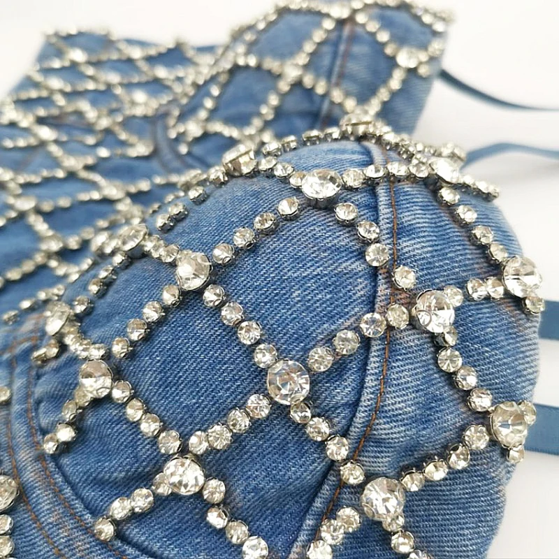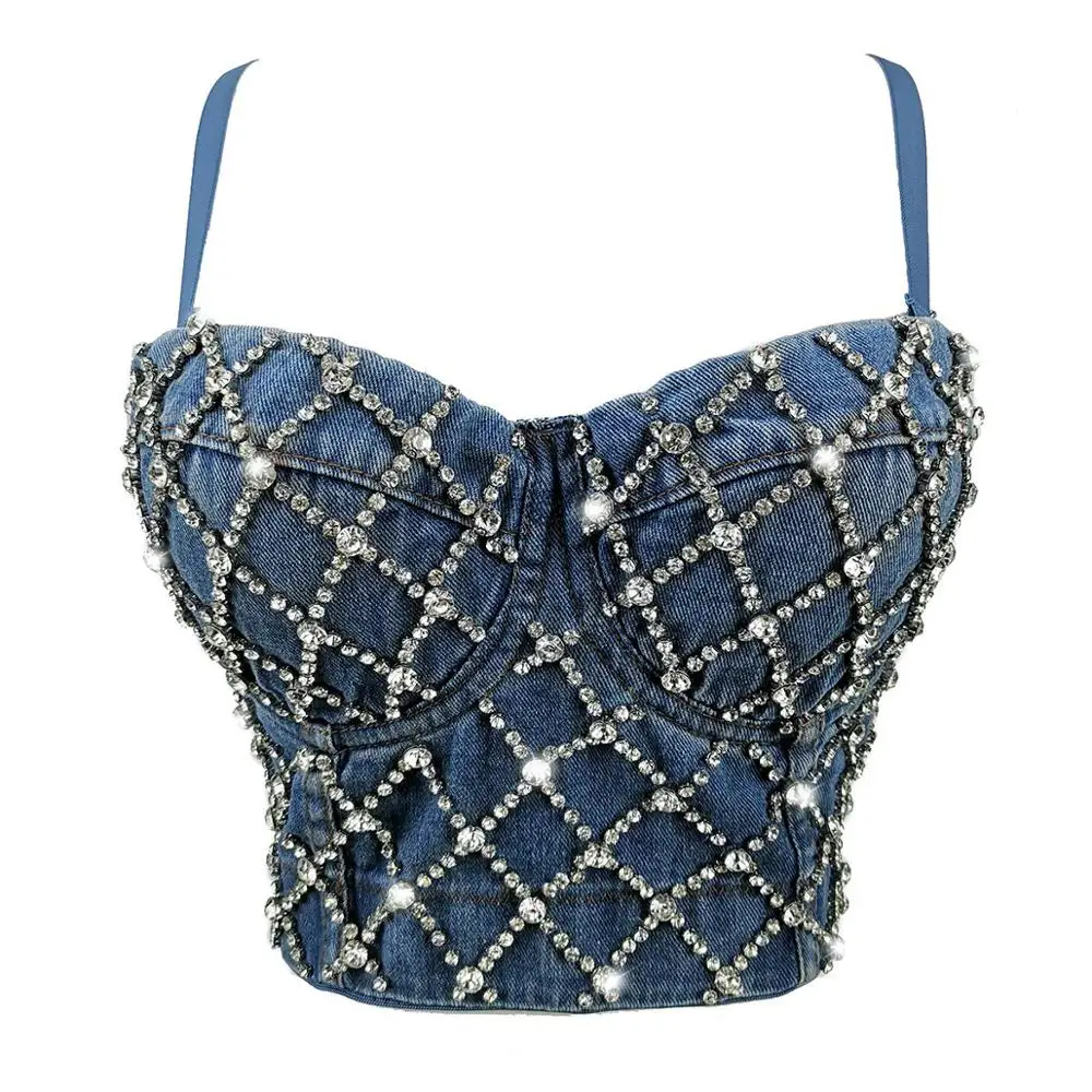 TOP Rhinestone Cropped Top Diamond Push Up Denim Bra Women's Sexy Glitter Top Party Christmas Halloween