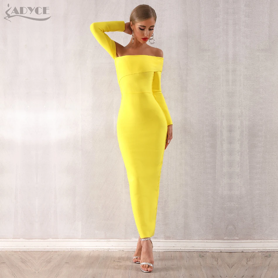 Adyce 2019 New Arrival Sexy Women Bandage Dress Long Sleeve Yellow Draped Off Shoulder Long Maxi Ce